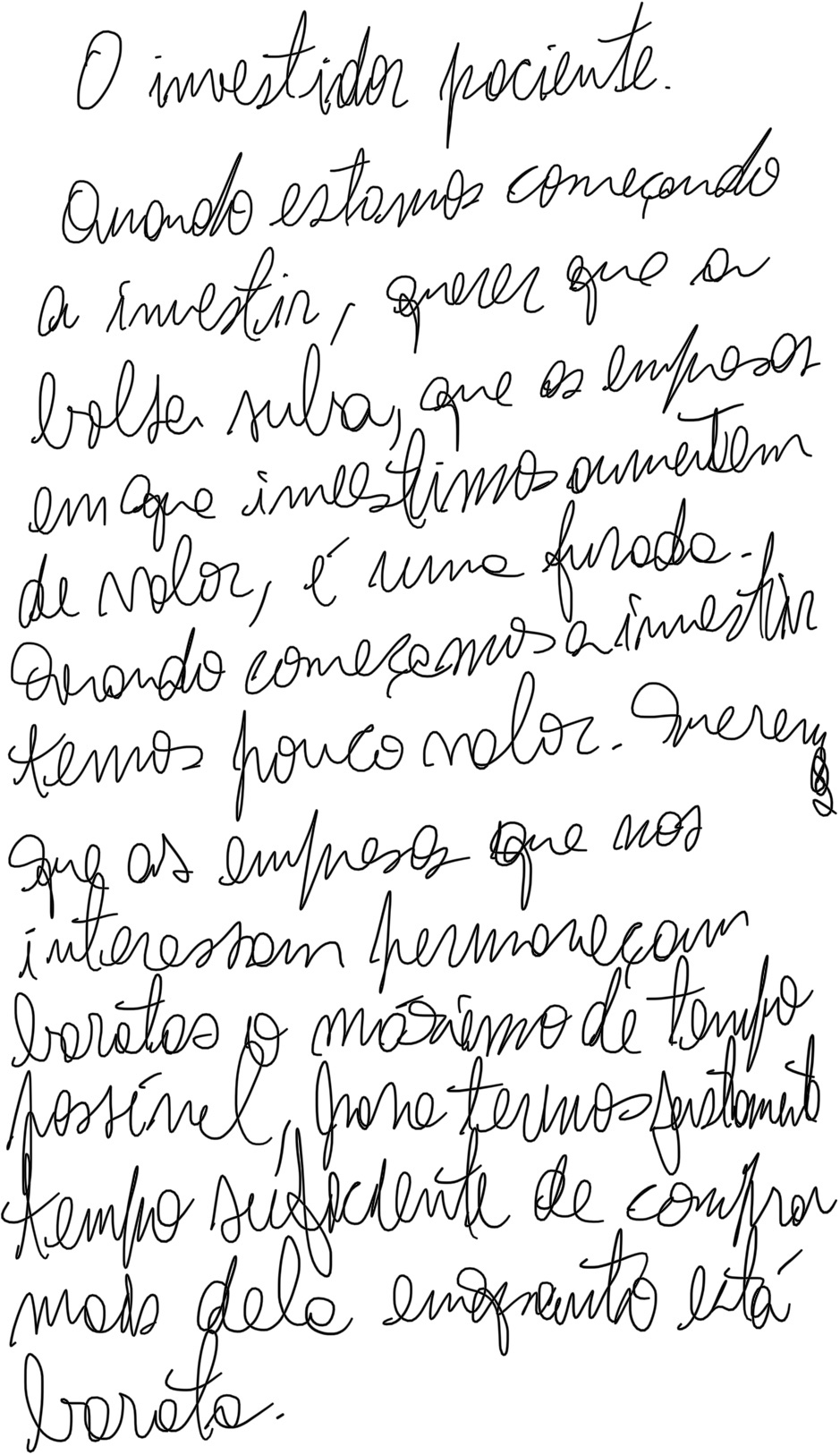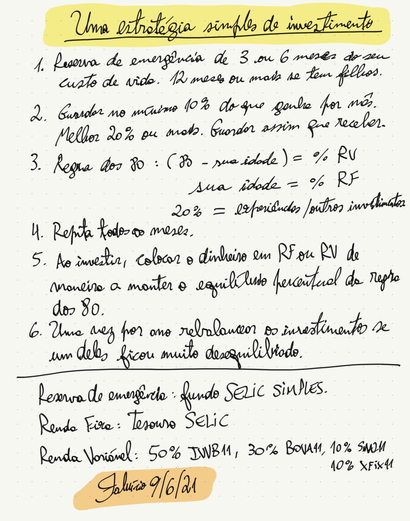Estou aqui para te ajudar a fugir disso tudo. Te ajudo uma vez só. A partir daí, caminha com tuas próprias pernas. Ensino aquele mínimo necessário para poder automatizar os investimentos de maneira a poder aplicar uma fórmula simples e eficiente todos os meses, sem precisar pensar demais, sem precisar aprender detalhes irrelevantes, e melhor de tudo, obtendo um resultado final melhor do que a maioria dos outros investidores. O simples bem aplicado sempre vence o sofisticado difícil de aplicar.