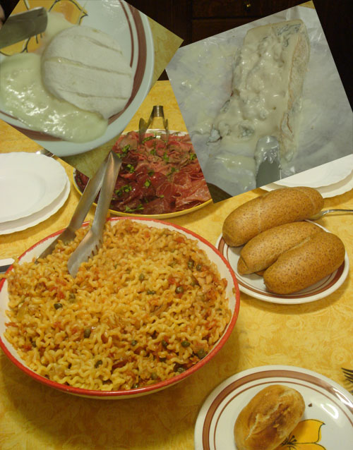 Massa (fusilli lungo con buco) com atum e alcaparras, pãozinho macio (difícil de encontrar na Europa), uma infinidade de salames e variedades desconhecidas no Brasil, queijo gorgonzola “de verdade”, tomino, um queijo de cabra com “casquinha” que comemos quente, derretendo no prato e na boca. Mais os licores e cafés que não apareceram na foto.